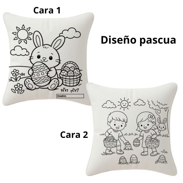 Son 2 diseños por cada cojín. Con espacios amplios y simples de colorear que buscan incentivar la imaginación de los niños. Hay un espacio en la base para rotularlos con su nombre y fecha, curso o actividad que se quiera destacar